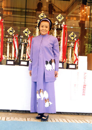 ラディソンホテル成田エアポート 千葉東パピヨンクラブ単独展にて 紫のシルクシャンタンに山本洋子画伯に パピヨンの絵を描いてもらったドレスです。 |